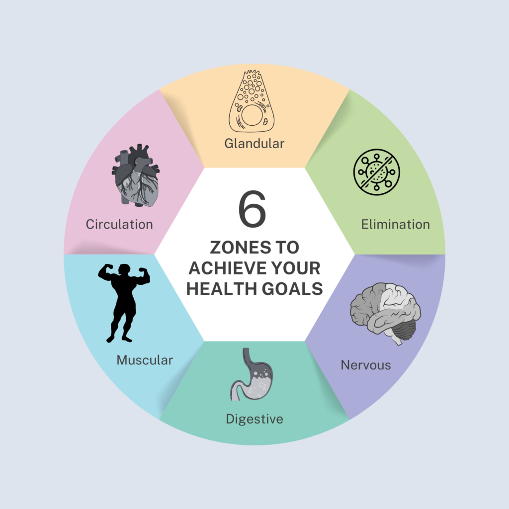 Zone Therapy is based on the principle that the body can be divided into six zones, each corresponding to a specific physiological system. These zones are the Glandular System, Elimination System, Nervous System, Digestive System, Muscular System, and Circulatory System. Each zone is connected not only to physical functions but also to emotional and mental states. When one or more zones are out of balance, it can lead to a variety of health issues, including stress, chronic pain, digestive problems, and more.